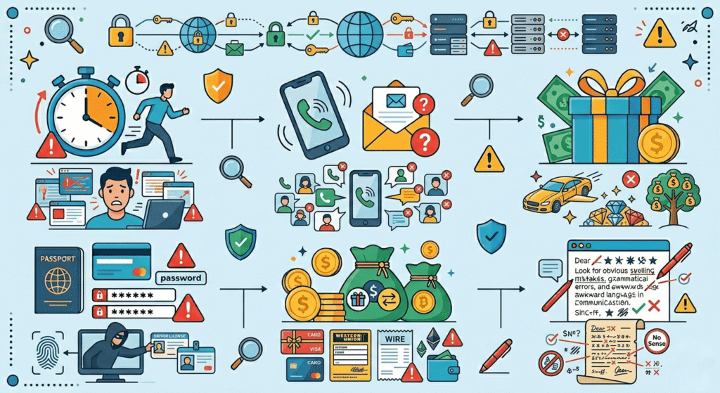 Incorrect language, suspicious links, and the kind of sweet deals that make you suspicious very much indicate possible scams. If your feelings get a kind of weird vibe, give weight to it.